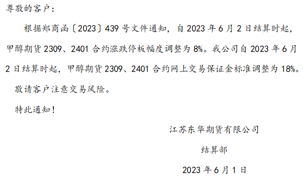 关于调整甲醇期货部分合约交易保证金标准和涨跌停板幅度的通知